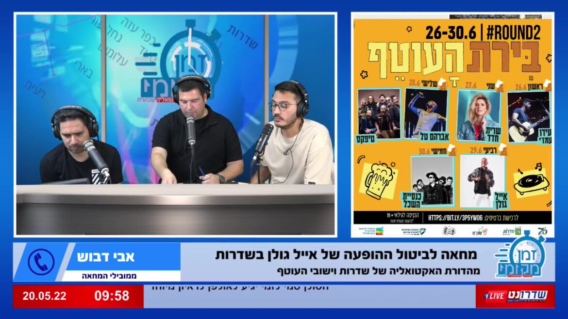 "זמן מקומי" 20.5.22 – המהדורה המלאה לצפייה מהדורת האקטואליה של שדרות וישובי העוטף: מחאת אייל גולן לקראת ההופעה בפסטיבל הבירה | תגובת מנהל אגף האירועים אופיר אסולין | סמי לזמי מגיע לראיון ראשון לרגל האיחוד של שפתיים ועוד by אורי גבאי 20 במאי 2022 written by אורי גבאי 20 במאי 2022 לצפייה במהדורה המלאה לחצו כאן חלק א' לצפייה במהדורה המלאה לחצו כאן חלק ב' 0 comment FacebookEmail related posts "אריק היה כבאי אמיץ שתמיד רץ ראשון לסייע" 20 בספטמבר 2024 צפו: מהדורת זמן מקומי עונה 3- תוכנית ראשונה... 24 באוגוסט 2024 זמן מקומי 9.9.22- המהדורה המלאה לצפייה 10 בספטמבר 2022 "לא ברחתי מהישיבה בגלל ניגוד עניינים. אולי דוידי... 10 בספטמבר 2022 "זמן מקומי" 24.6.22- המהדורה המלאה לצפייה 25 ביוני 2022 "זמן מקומי" 10.6.22 – המהדורה המלאה לצפייה 11 ביוני 2022 "כולנו מסכימים שהליך מינוי רב ראשי כבר לא... 11 ביוני 2022 למה החלטתי לחזור מבית שאן לשדרות? 3 ביוני 2022 "זמן מקומי" 27.5.22 – המהדורה המלאה לצפייה 27 במאי 2022 "זמן מקומי" 13.5.22 – המהדורה המלאה לצפייה 15 במאי 2022