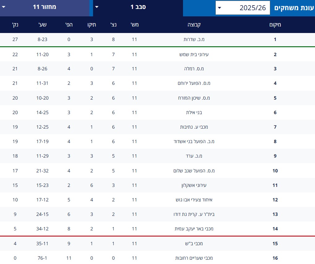 מ.כ שדרות ממשיכה לשמור על המקום הראשון לאחר שאתמול (חמישי בערב) השיגה ניצחון ביתי חשוב מאוד בקרב הצמרת מול השנייה בטבלה ערב המחזור מ.ס רמלה. בעקבות תוצאות המחזור, הפער בטבלה אף צמח ל-6 נקודות מרמלה ו-5 נקודות מעירוני בית שמש שניצחה היום (שישי) את האחרונה בטבלה מכבי שעריים, 3:0.
