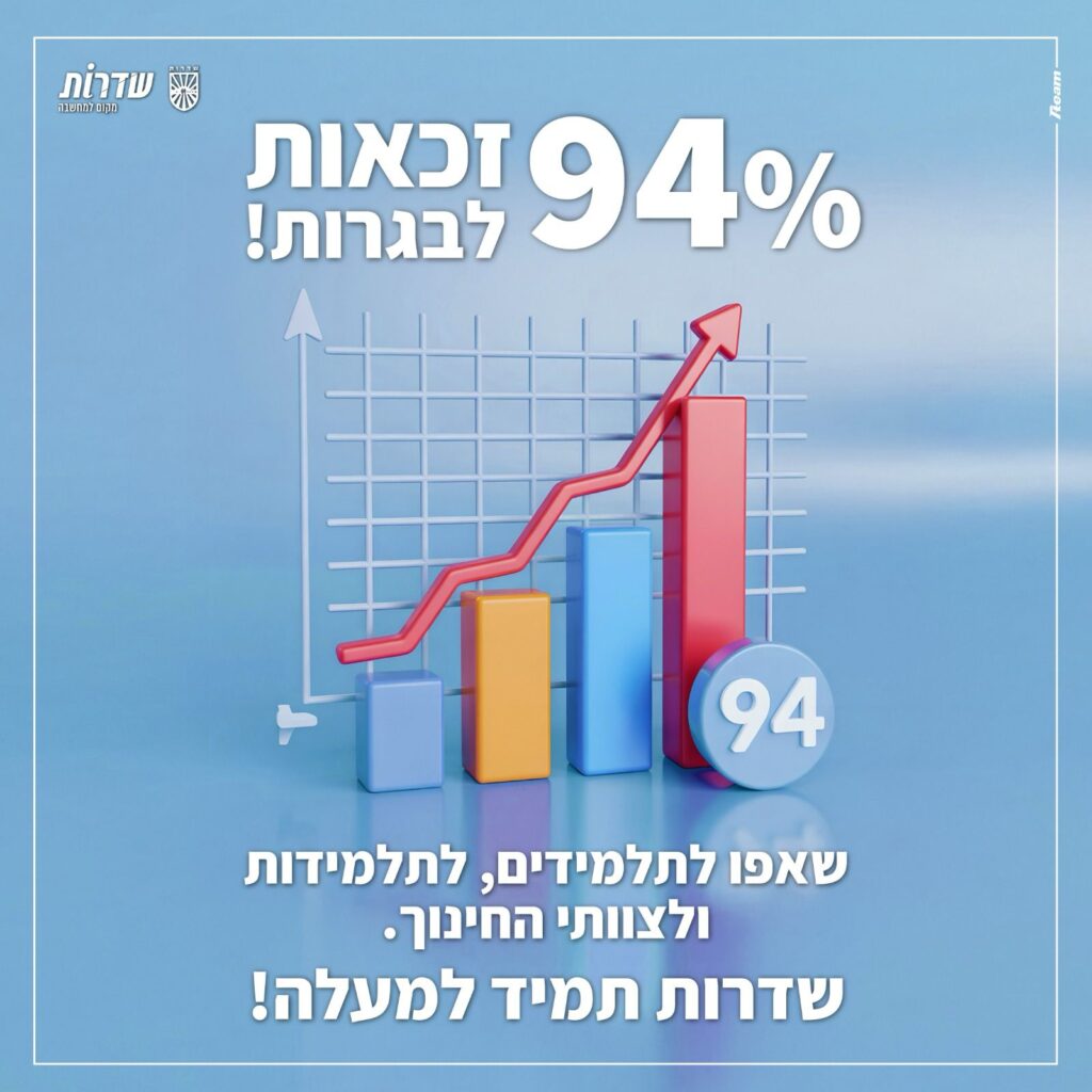 לפי הנתונים, שיעור הזכאות לבגרות בשדרות עומד על 94%, מהגבוהים בישראל. גם שיעור הבגרות המצטיינת זינק ל־ 14% לעומת 5% בלבד בשנה הקודמת. בתחום המתמטיקה ברמת חמש יחידות נרשמה קפיצה משמעותית ל־23.5% לעומת ממוצע ארצי של 16%. באנגלית חמש יחידות שדרות מובילה בפער ניכר – 67% לעומת ממוצע ארצי של 46%. וגם בתחום הבגרות הטכנולוגית נרשם הישג: 13% מתלמידי העיר נבחנו במסלול זה, מעל הממוצע הארצי העומד על 11%.