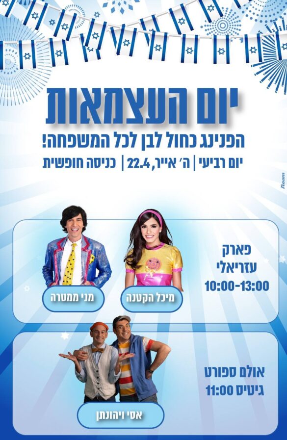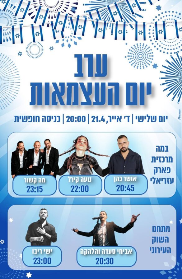 ביום רביעי 22.4, בין השעות 10:00 ל-13:00, יתקיים בפארק עזריאלי הפנינג “כחול לבן” לכל המשפחה, עם כוכבי הילדים מיכל הקטנה ומני ממטרה, לצד הופעות של להקות המחול המקומיות. במקביל, באולם גיטיס ייערך גם המופע של אסי ויהונתן. הכניסה לכל האירועים חופשית.